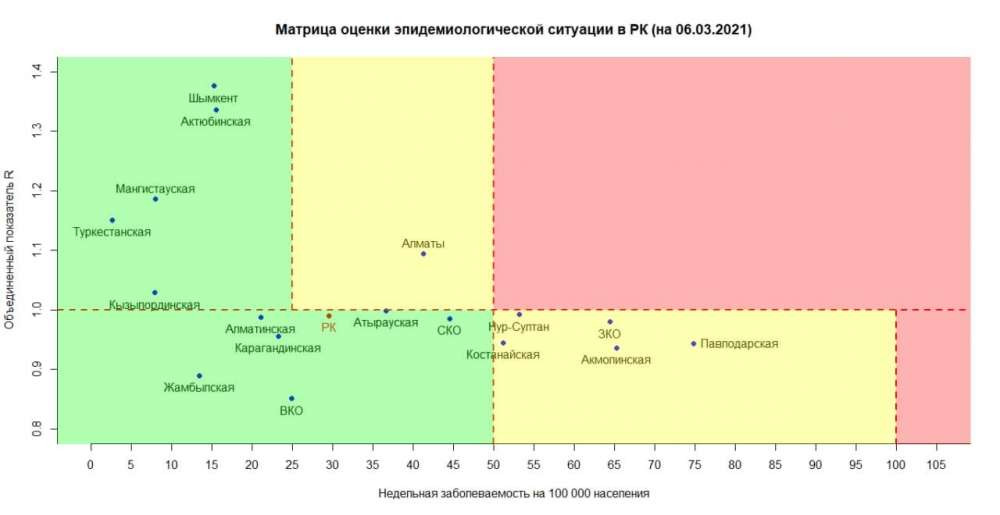 Опубликована матрица оценки эпидемиологической ситуации в регионах Казахстана на 6 марта 2021 года, передает