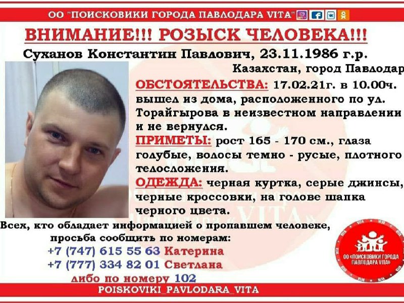 "Если вы видели этого человека или знаете о его местонахождении, немедленно сообщить в полицию по номеру "102" или позвонить в поисковый отряд VITA по телефонам: +7 747 615 55 63, + 7 777 334 82 01", - пишут волонтеры.