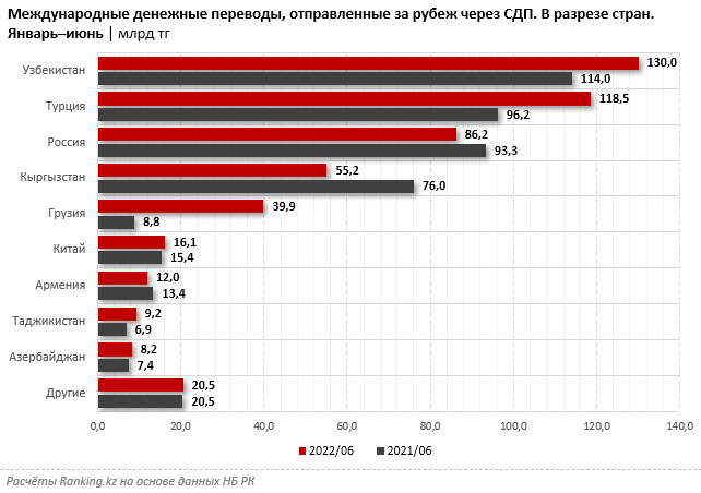 Половина объёма денежных переводов, отправленных из Казахстана за рубеж через СДП за январь–июнь 2022 года была отправлена в Узбекистан (130 млрд тг) и Турцию (118,5 млрд тг). Значительные объёмы переводов из РК также пришлись на Россию (86,2 млрд тг), Кыргызстан (55,2 млрд тг) и Грузию (39,9 млрд тг).