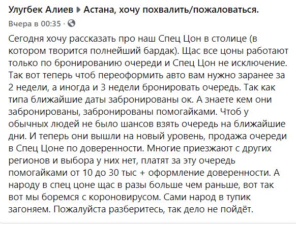 Напомним, ранее посредники обещали переоформить автотранспорт за два-три часа при предоставлении документов на машину, ЭЦП, а также при наличии удостоверения владельца и покупателя. За услуги "помогайки" просили 10 тысяч тенге. Например, вот что пишет об этом житель Нур-Султана Углугбек Алиев в Facebook.