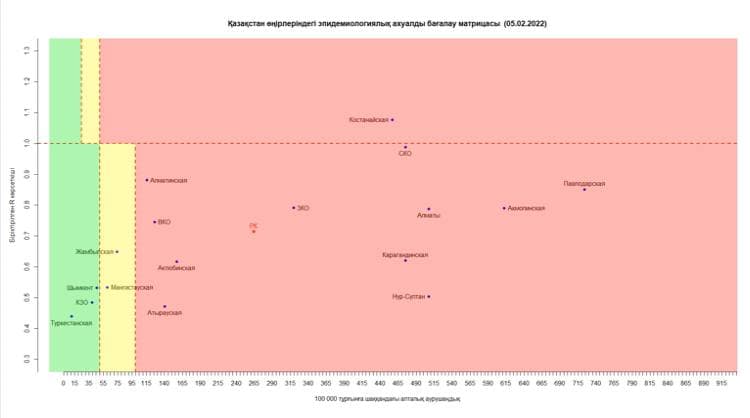 Опубликована матрица оценки эпидемиологической ситуации в регионах Казахстана на 5 февраля 2022 года, передает BaigeNews.kz.