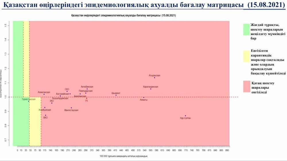Опубликована матрица оценки эпидемиологической ситуации в регионах Казахстана на 15 августа 2021 года, передает BaigeNews.kz со ссылкой на coronavirus2020.kz.