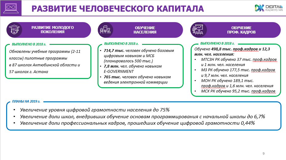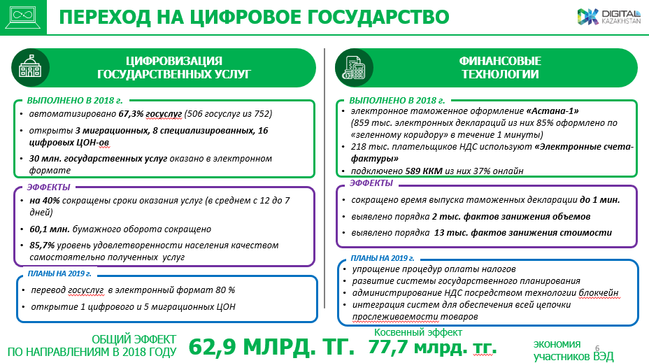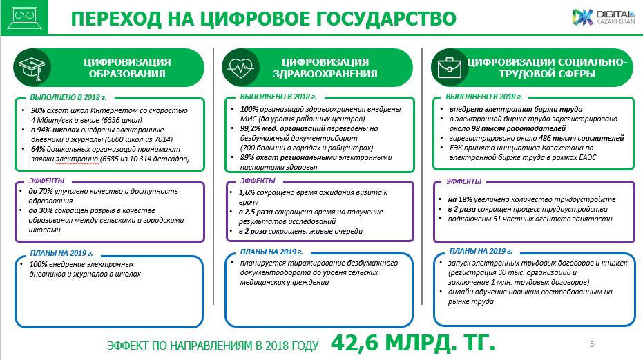 "Продолжаются работы по переводу государственных услуг в электронный формат. На 2019 год запланирован перевод 80% госуслуг в электронный формат, а также открытие дополнительно 1 цифрового и 5 миграционных ЦОНов", - сказал Даурен Абаев.