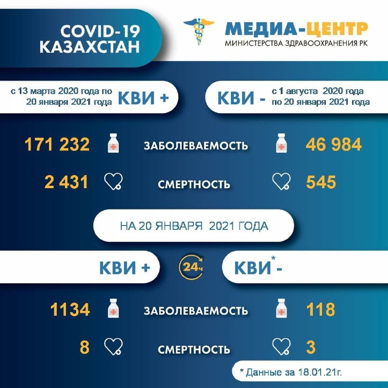 По данным Telegram-канала Coronavirus2020.kz, 18 января зафиксированы 118 случаев заболевания пневмонией с признаками коронавирусной инфекции, три летальных исхода и 149 выздоровевших.