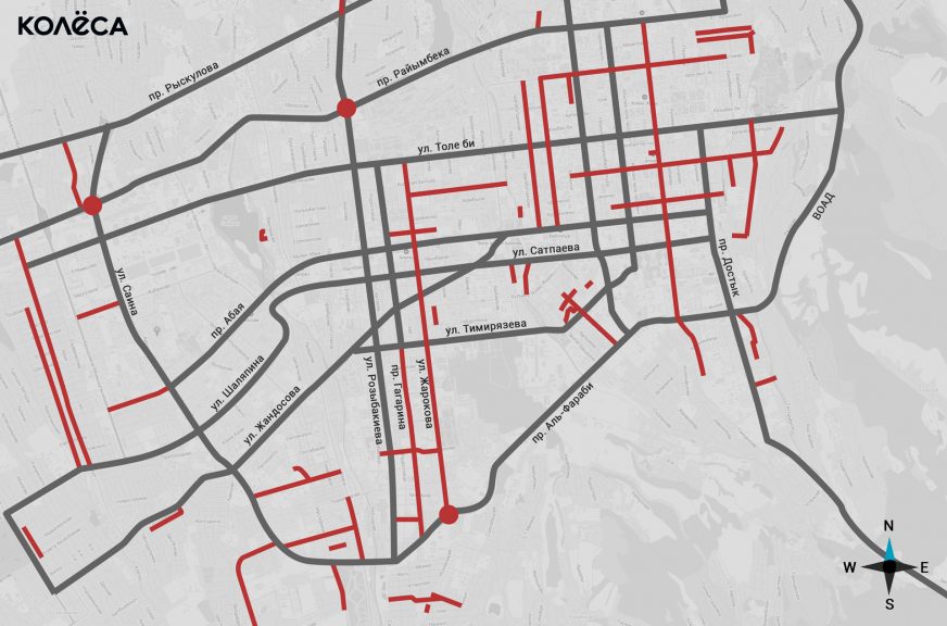 - северная часть проспекта Назарбаева ниже Райымбека, где строится развязка на пересечении с улицей Жансугурова.
