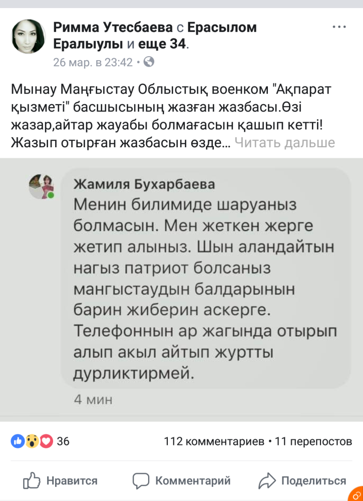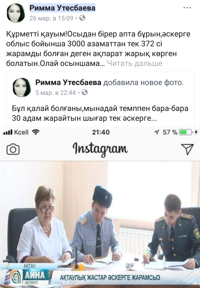 После трансляции новостей блогер (жительница Тупкараганского района Мангистауской области) Римма Утесбаева обратилась к руководителю пресс-службы Департамента по делам обороны Мангистауской области Бухарбаевой с целью уточнить данный факт.