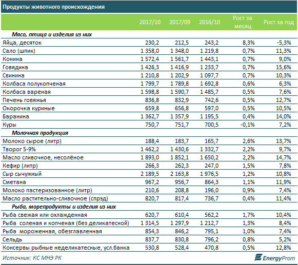 По итогам октября наиболее заметно среди всей продукции животного происхождения выросли в цене яйца - на 8,3% за месяц до 230,2 тенге за десяток. Прочие продукты в сегменте мяса, птицы и изделий из них подорожали к сентябрю на более чем 1%.