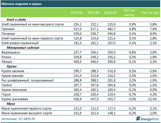 В сегменте мучных изделий и круп значительного роста цен не отмечено. Удешевление зафиксировано для гречневой крупы - сразу минус 3% к сентябрю, до 336,6 тенге за кг.