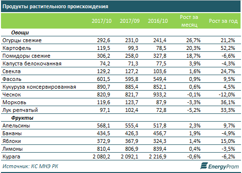 Так, огурцы за месяц подорожали на 26,7% к сентябрю (до 292,6 тенге за кг), картофель - на 20,3% (до 119,5 тенге за кг), помидоры - на 18,7% (до 306,2 тенге за кг).