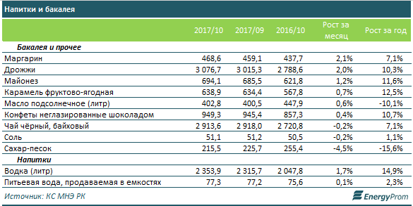 Среди продуктов бакалеи подорожали маргарин (+2,1% за месяц, до 468,6 тенге), дрожжи (+2%, до 3,1 тыс тенге за кг) и майонез (+1,2%, до 694,1 тенге). На 4,5% подешевел сахар до 215,5 тенге за кг. Подорожали и напитки: водка +1,7% за месяц, до 2,4 тыс тенге за литр, вода +0,1%, до 77,3 тенге за литр.