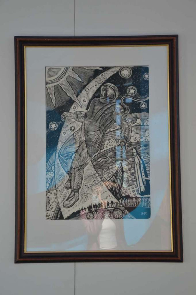 Значительный раздел экспозиции знакомит с творчеством выдающихся казахстанских графиков: Амана Бахтыгалиева, Николая Гаева, Темирхана Ордабекова, Евгения Сидоркина. Каждый автор представляет собственное индивидуальное видение освоения космоса, прежде всего, через образы людей, осуществляющих запуск ракет ученых, покоряющих небо отважных космонавтов, наблюдающих за полетом современников.