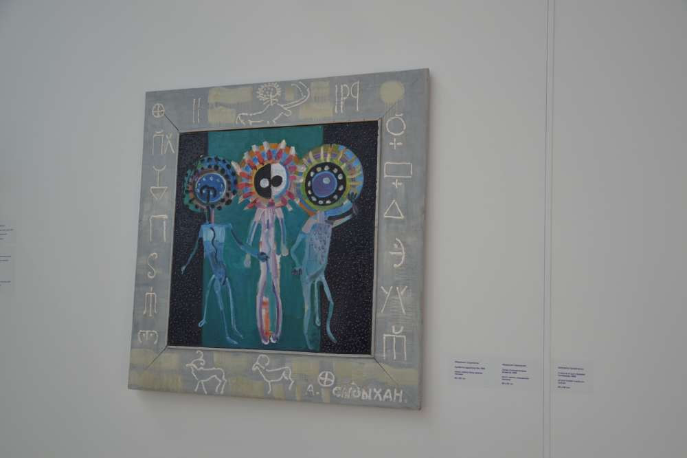 Также планетарный масштаб в работах Абдрашита Сыдыханова проявлен сложными отношениями сферических тел и таинственных свечений. Художник изобразил обитателей иных галактик солнцеголовыми персонажами древних петроглифов.