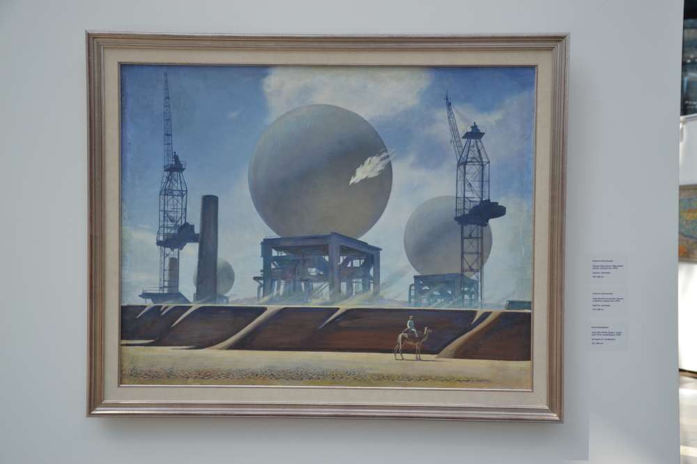 Особое место в теме освоения космоса занимает художник Камиль Муллашев. Объекты на его картинах изображены на фоне бескрайних казахстанских степей. Художник рассказал, что путешествовал по всему Казахстану, чтобы написать триптих, куда входят три композиции "Над белой пустыней. Земля и время. Казахстан", "Юность. Земля и время. Казахстан", "Хлебная страда. Земля и время. Казахстан". На выставке представлена первая композиция.