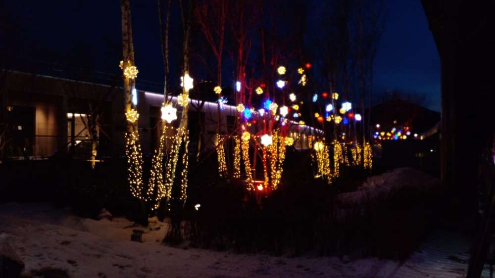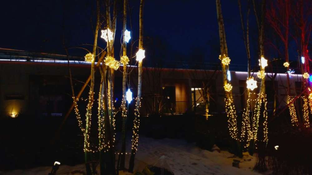 Подсвечивают даже некоторые деревья, которые по пекинской традиции подпирают колышками.