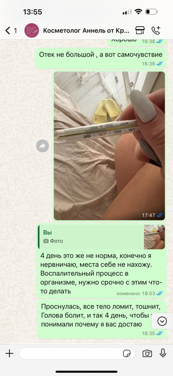 Косметолог отказалась вернуть деньги, не предоставила сертификаты на препараты и заявила, что покупала их "в магазине". Ольга подчёркивает, что процедура проводилась в антисанитарных условиях, без лицензии и без оформления каких-либо документов.