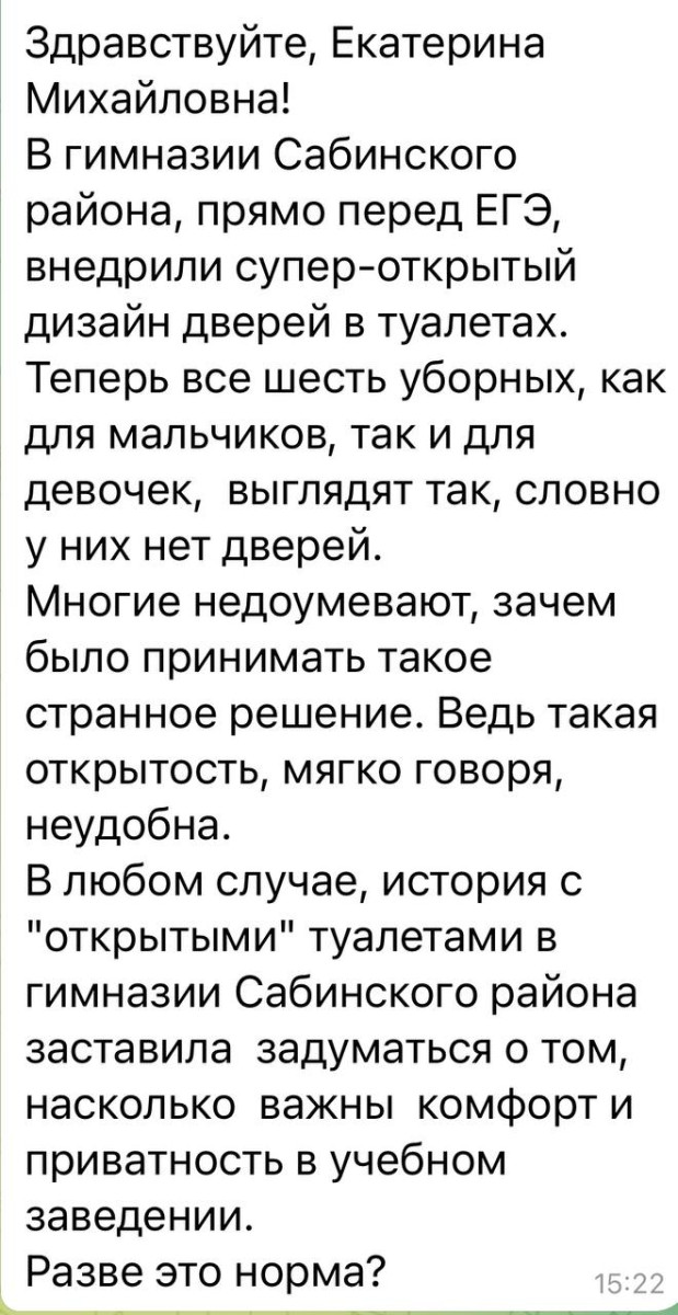 "В Татарстане перед ЕГЭ в одной из школ установили открытые туалеты. Убрали верхнюю часть дверей кабинки туалетов, предположительно, из-за опасения списывания во время экзаменов. Теперь высота дверей составляет всего 1,4 метра. Подростки не оценили новый "опенспейс". Теперь они все пишут мне по этому поводу", - сообщила Мизулина.