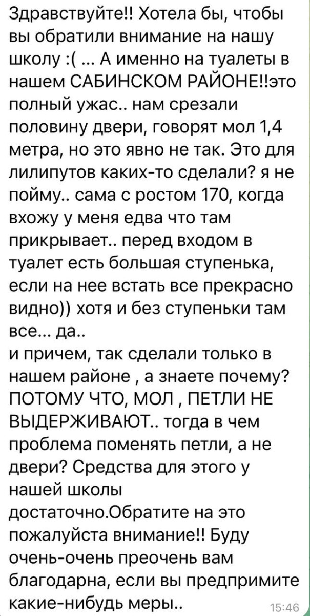 Подписчики из других регионов России сообщили активистке, что в их школах кабинки в таулетах и вовсе разобрали.