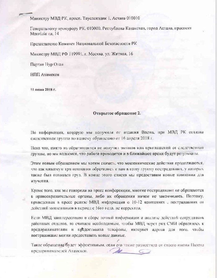 "Мы подготовили повторное обращение в МВД РК, его подписали 18 компаний из разных регионов Казахстана. Второе появилось после ответа на первое письмо. На него министерство отреагировало своим комментарием, что 12 пострадавших компаний за два года – это не так уж много. За короткий период времени к нам обратились ещё шесть компаний. Если мы начнём дальше копать, мы найдём ещё больше потерпевших", - сказал Жомарт Есентугелов.