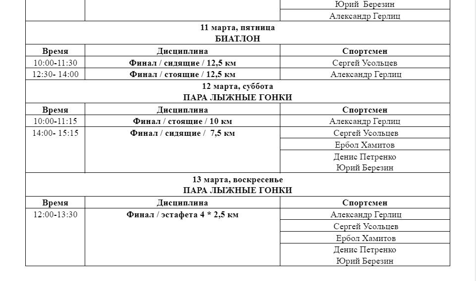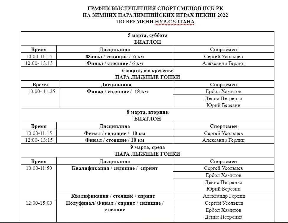 В состав национальной паралимпийской сборной РК вошли пять спортсменов: Александр Герлиц, Ербол Хамитов, Сергей Усольцев, Юрий Березин и Денис Петренко. Они будут выступать по двум видам спорта: пара лыжные гонки и пара биатлон.