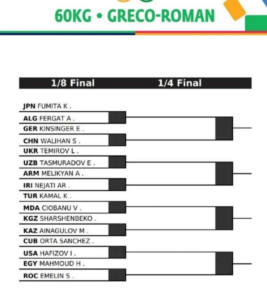 Первым из команды Казахстана в весовой категории до 60 килограммов на ковер выйдет призер чемпионатов мира, Азии и Азиатских игр, "классик" Мейрамбек Айнагулов. Соперником казахстанца станет представитель Кыргызстана, призер чемпионатов мира и Азии Жоламан Шаршенбеков.
