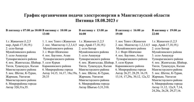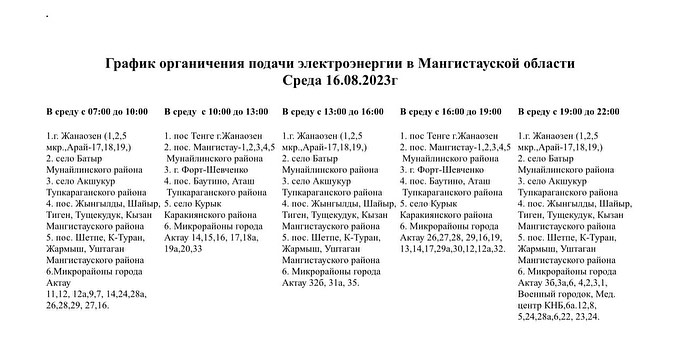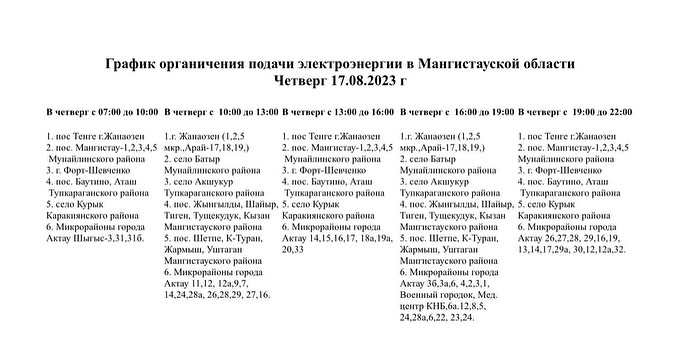 График отключения электроэнергии в Мангистау составлен с 15 августа до 18 августа включительно. "О дальнейшем возможном продлении данного режима подачи электроэнергии жители области будут оповещены заранее", — отметили в ЦОК.