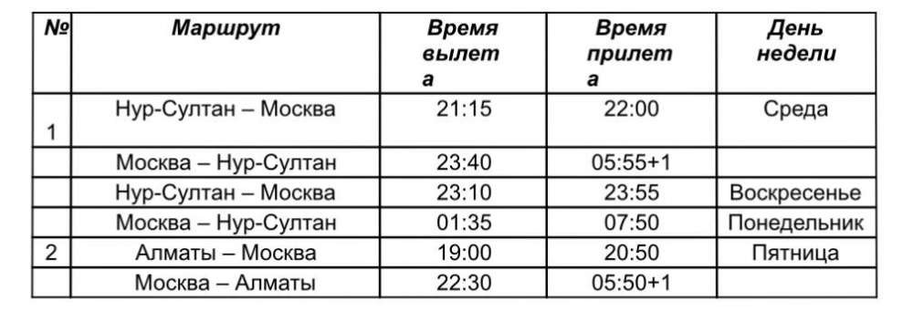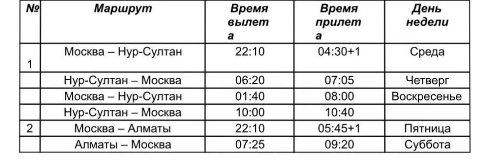 По информации авиакомпании "Аэрофлот", предварительно с 10 февраля 2021 года планируется выполнение следующих рейсов между Казахстаном и Россией: