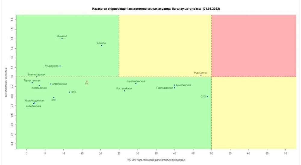 Опубликована матрица оценки эпидемиологической ситуации в регионах Казахстана на 1 января 2022 года, передает BaigeNews.kz со ссылкой на coronavirus2020.kz.