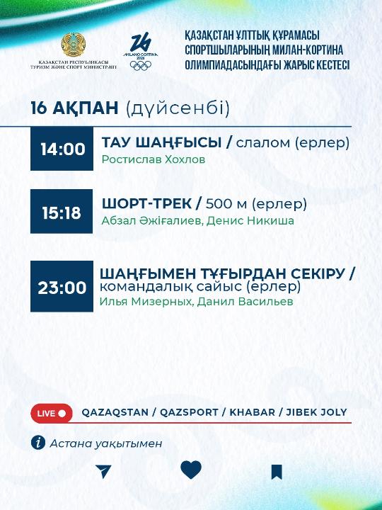 Национальный Олимпийский комитет опубликовал расписание соревнований, в которых будут участвовать казахстанские спортсмены на Олимпиаде-2026 13 февраля, передаёт BAQ.KZ.