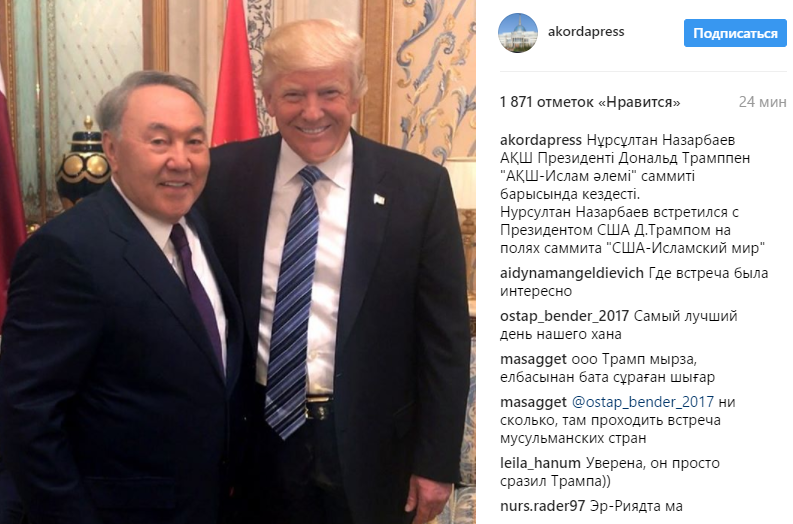 Напомним, что Президент Казахстана Нурсултан Назарбаев провел переговоры с рядом глав государств, руководителями делегаций в рамках Саммита «США - Исламский мир» и с Президентом США Дональдом Трампом. В рамках участия в Саммите «США - Исламский мир» Президент Казахстана провел краткие переговоры с рядом глав государств и руководителями делегаций. В частности, Нурсултан Назарбаев побеседовал с Президентом США Д.Трампом. Были обсуждены основные направления двустороннего взаимодействия, включая перспективы углубления связей в торгово-экономической, политической и культурно-гуманитарной сферах. Президенты двух стран также обменялись мнениями по ряду вопросов международной повестки дня.