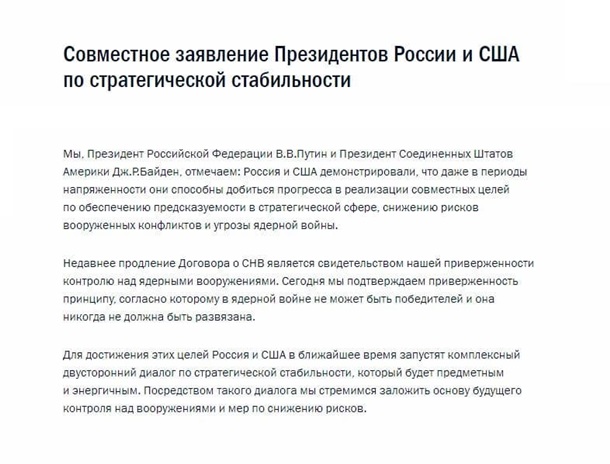 Опубликовано совместное заявление президентов США и России Джо Байдена и Владимира Путина относительно стратегической стабильности, передает BaigeNews.kz.