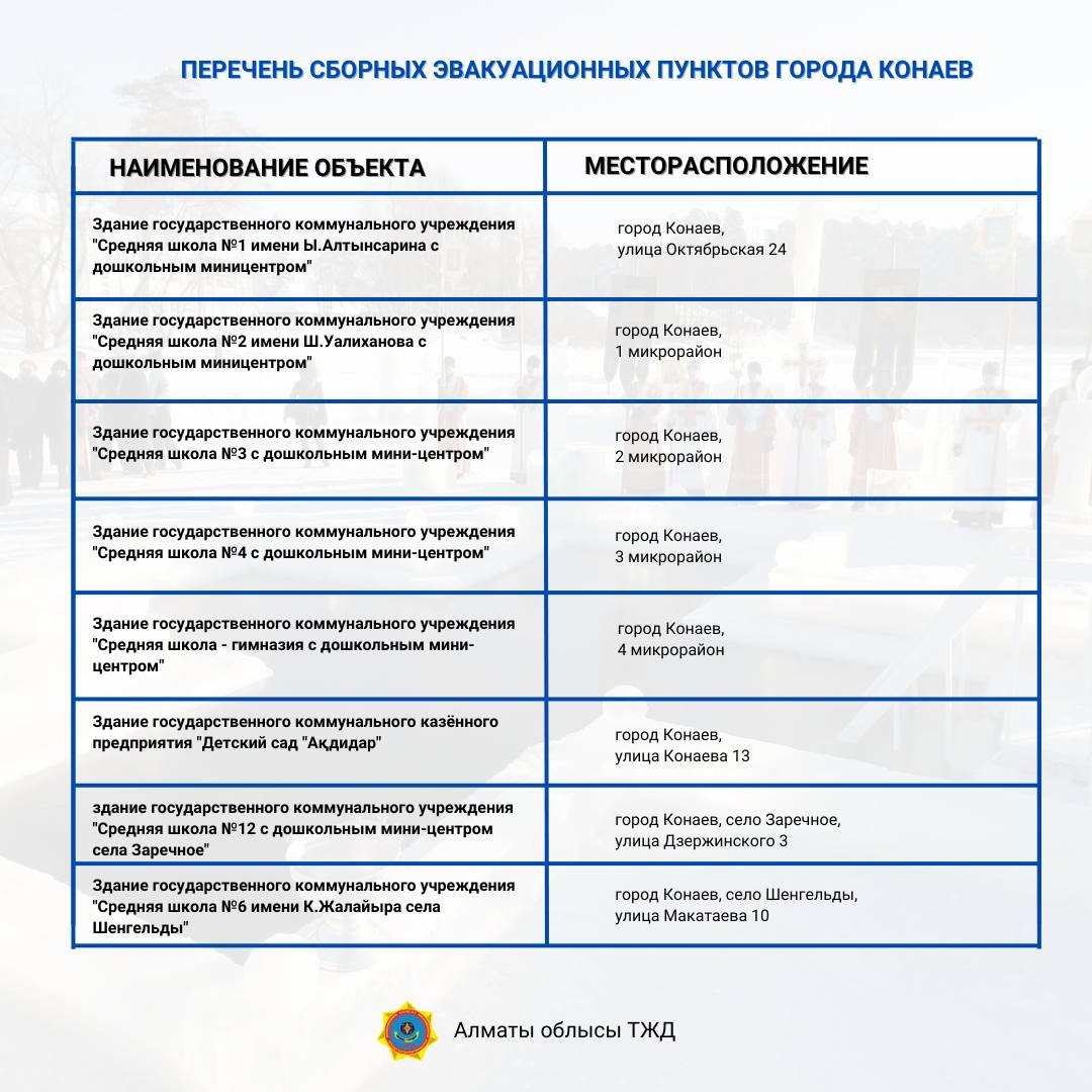 Акимат Алматинской области распространил информацию с перечнем сборных эвакуационных пунктов города Конаев, передаёт BaigeNews.kz.