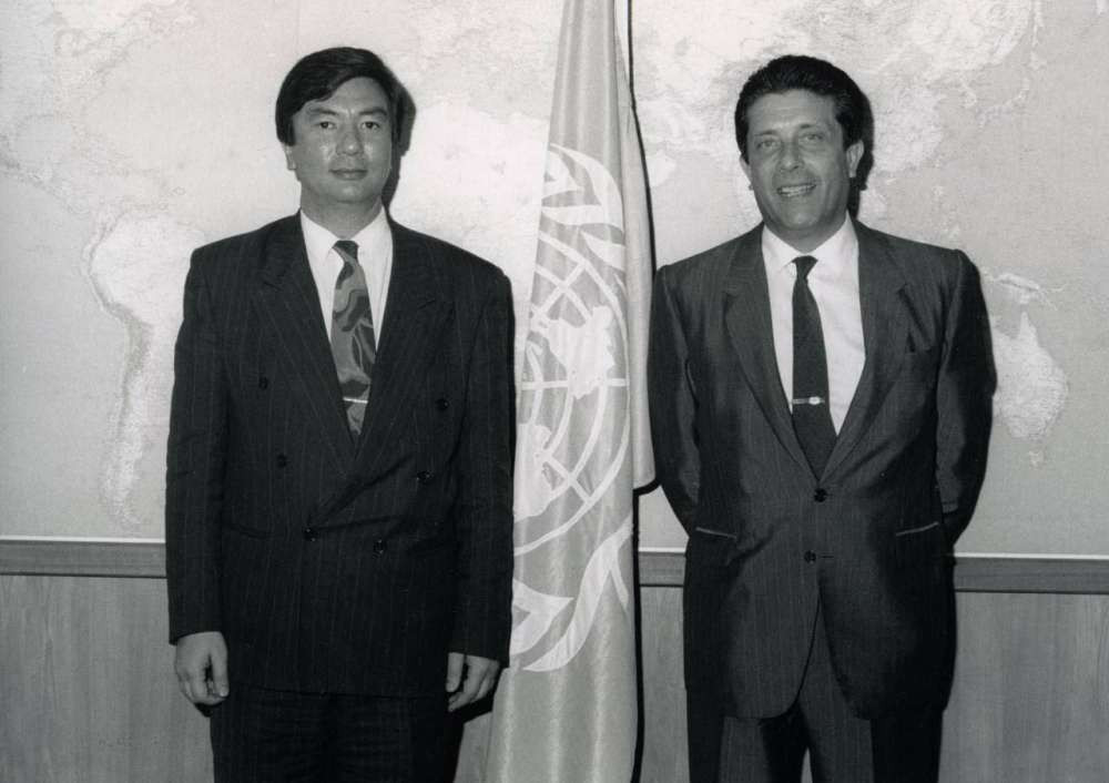 На следующем снимке − совместное фото Касым-Жомарта Токаева и Генерального директора ЮНЕСКО Федерико Майора после церемонии подписания акта о вступлении Казахстана в ЮНЕСКО 22 мая 1992 года.