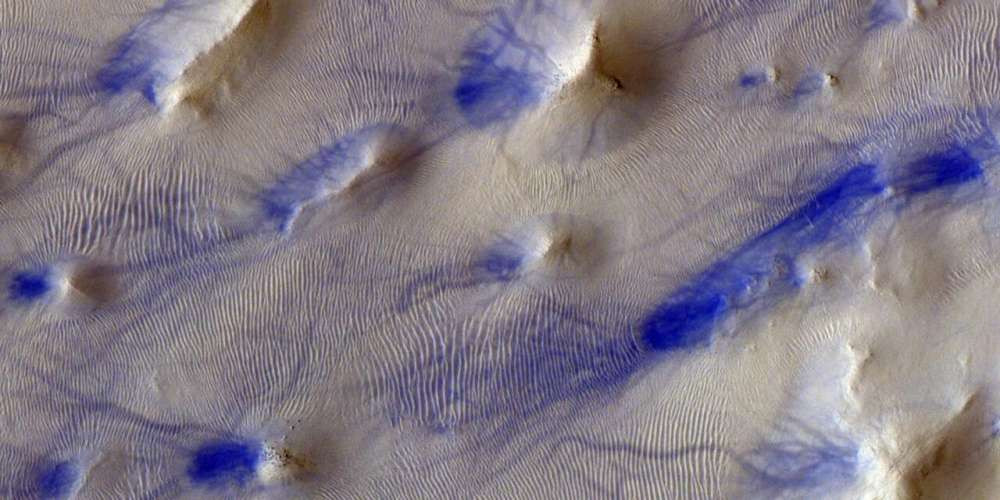 Самой главной особенностью здесь являются тонкие усики − темные следы от вихрей пыли, которые возникают как на Марсе, так и на Земле, когда теплый воздух быстро поднимается в более холодную зону. Эти вихри оставляют следы на поверхности планеты. Бороздки ориентированы с севера на юг, это указывает на преобладающие направления ветра.
