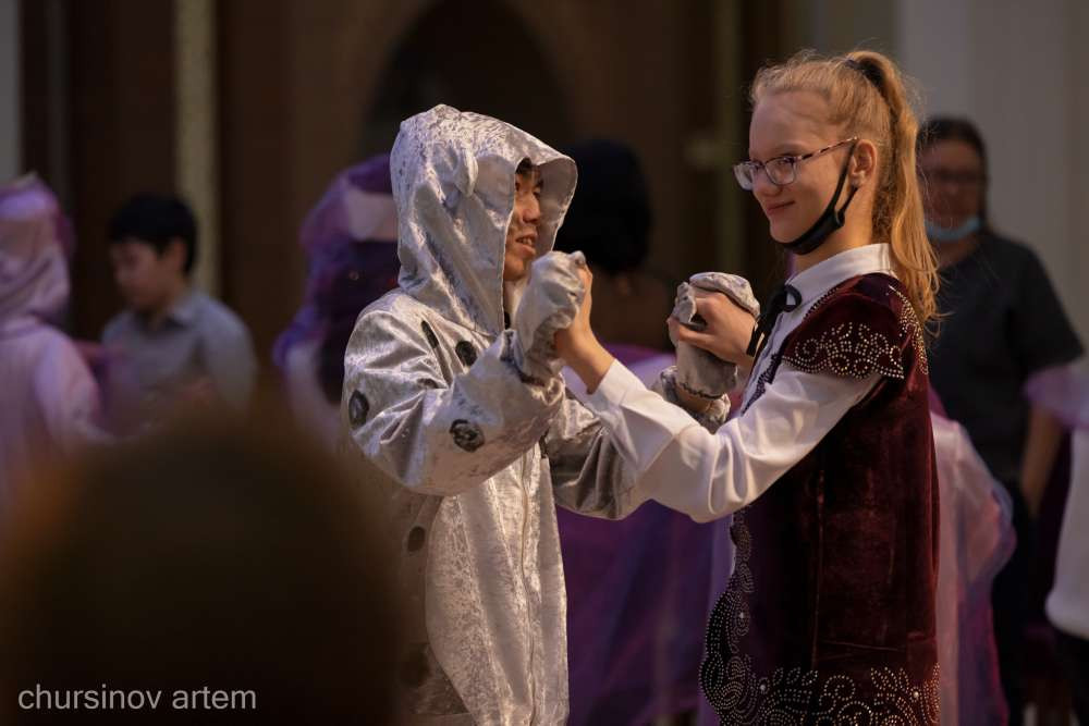 В спектакле участвуют сотрудники музея. Они пригласили школьников для того, чтобы они могли посмотреть и поучаствовать в нашем представлении. Один ученик, к примеру, играет в спектакле роль внука одной из героинь.
