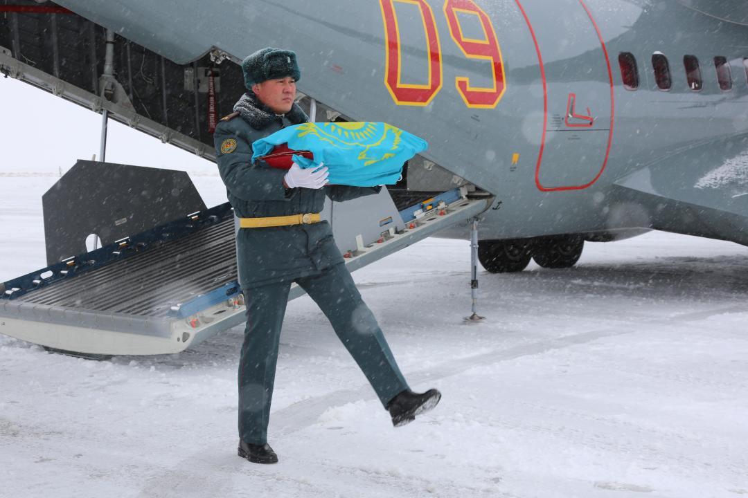 Торжественная церемония встречи останков воина-казахстанца была организована в военном секторе аэродрома Тараза.