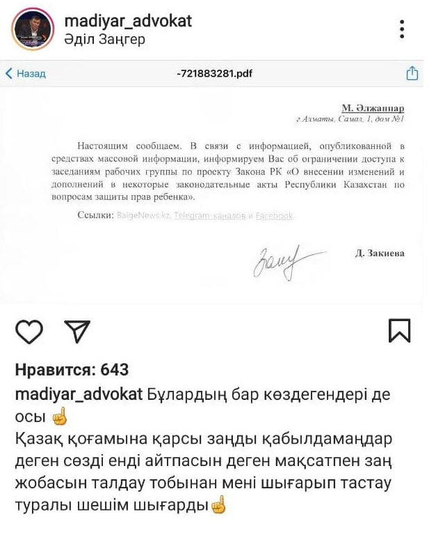Об этом Альжаппаров написал в своем аккаунте в Instagram - он опубликовал письмо за подписью председатель республиканского общественного совета по вопросам семьи, женщин и защите прав детей при партии Nur Otan Динары Закиевой, которая возглавляет рабочую группу по обсуждению законопроекта "О противодействии семейно-бытовому насилию".