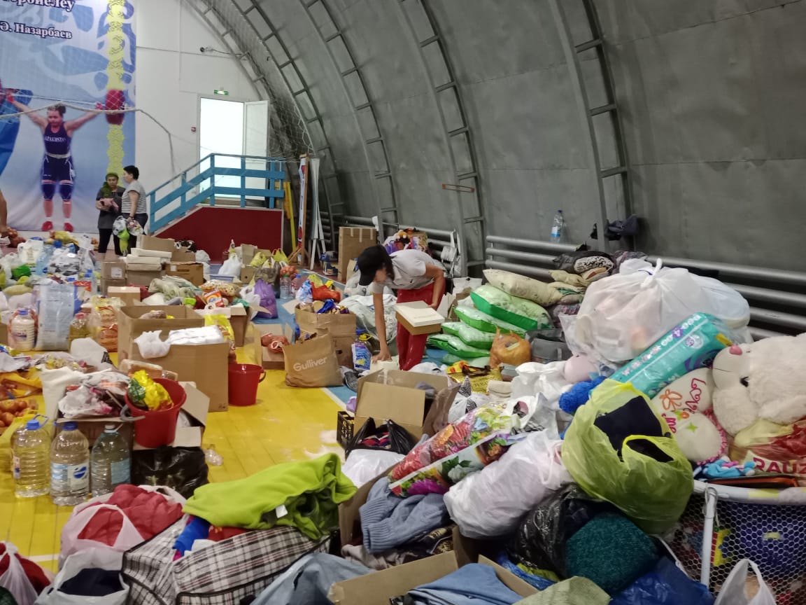 "Только за вчерашний день мы приняли более сотни грузовых и легковых машин. Поступает как централизованная помощь со всех уголков области и страны, так и частная. Нам главное закрыть потребность в продуктах питания, чтобы те, кто пострадал в огне, ни в чем не нуждались. А вот одежду пока не принимаем, её очень много", — говорит координатор пункта приема гуманитарной помощи Жазира Жаппасова.