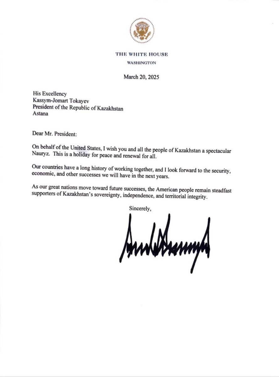 "От имени Соединенных Штатов Америки поздравляю Вас и весь народ Казахстана с прекрасным Наурызом –праздником мира и всеобщего обновления. Наши страны связывает долгая история взаимовыгодного сотрудничества, и я уверен, что в будущем мы добьемся новых успехов в сферах безопасности, экономики и других областях. В то время как наши великие нации устремлены к новым достижениям, американский народ подтверждает свою неизменную приверженность суверенитету, независимости и территориальной целостности Казахстана", – написал Дональд Трамп.