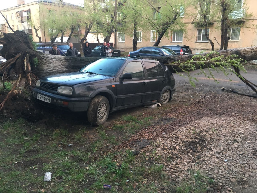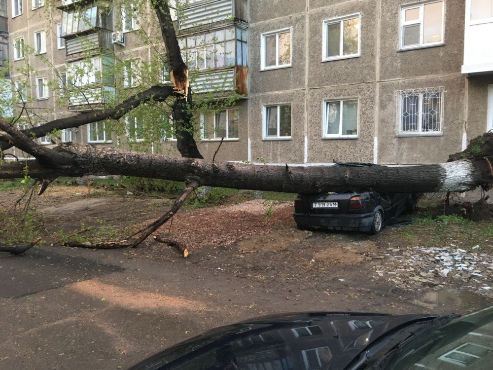 В 20 микрорайоне возле ТД "Корона" сильным ветром унесло торговые палатки. Здесь же выбило стёкла в рыбном магазине. На одной из центральных улиц дерево придавило несколько легковых автомобилей, оборвало электрические провода.