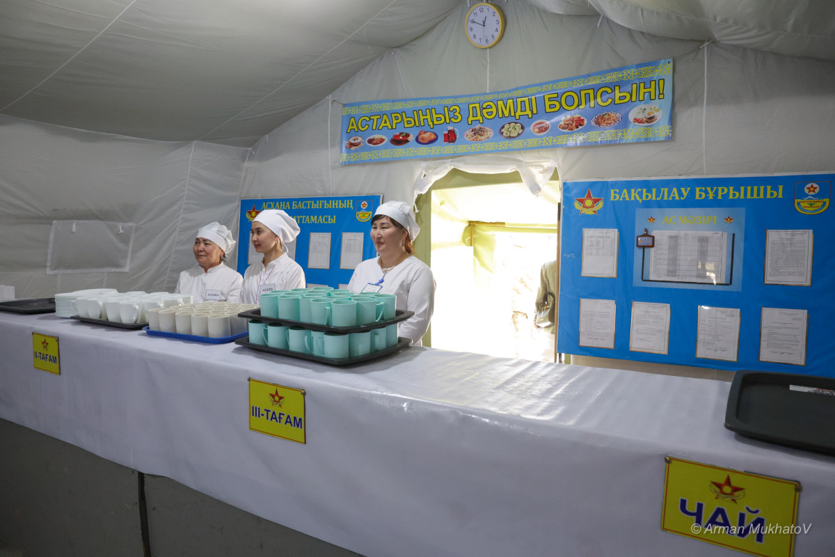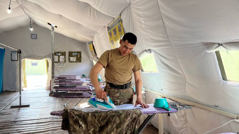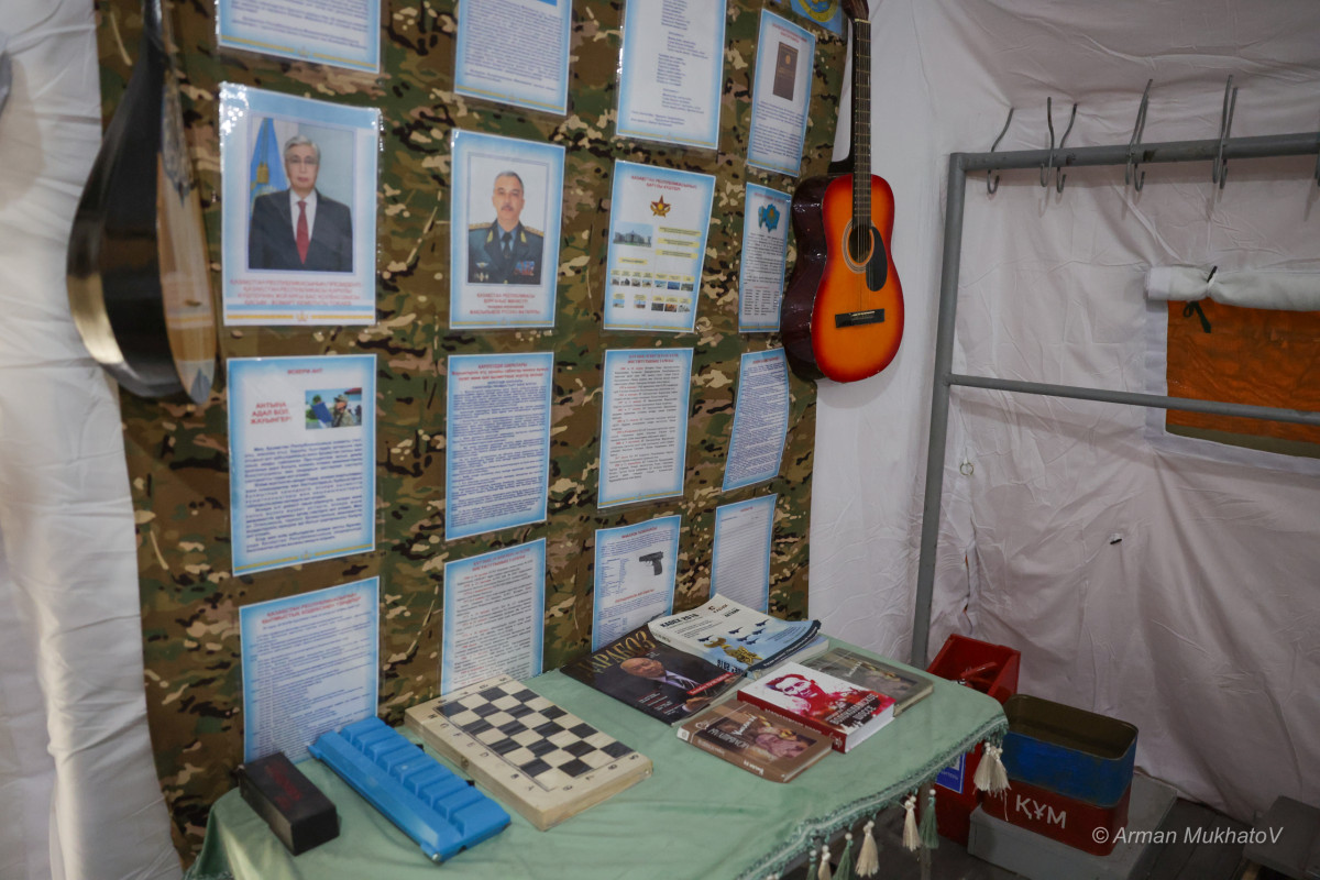 В палатках — порядок: аккуратно заправленные кровати, сложенные по уставу одеяла, личные вещи разложены строго по местам. В свободное время солдаты могут почитать книги, сыграть в настольные игры или взять в руки гитару и домбру — всё это собрано в небольшом армейском уголке.