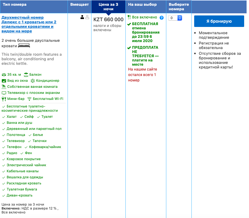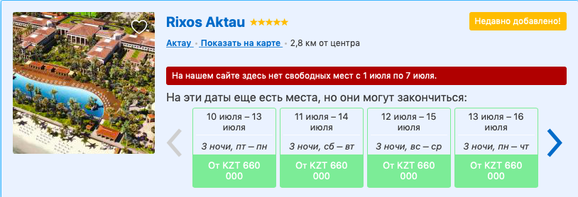 В ведомстве отметили, что отель планируют открыть в начале июля, но туры уже имеются в продаже. Однако свободных мест с 1 июля на популярном сайте Booking.com уже не оказалось. Через посредников туры оказались значительно дороже. Всего за три ночи посетитель отеля раскошелится на 660 тысяч тенге.