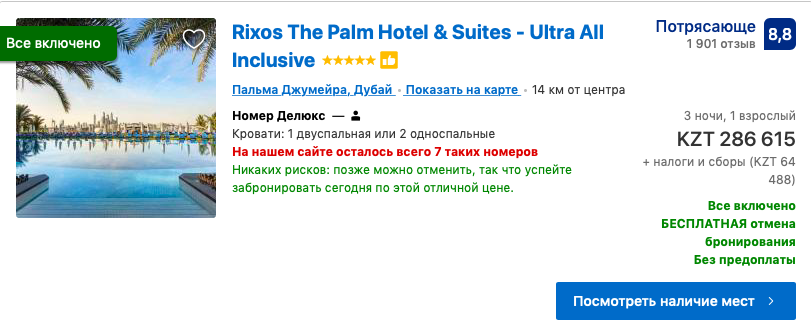 Средняя цена за три ночи в пятизвездочном отеле в номере делюкс на одного человека, к примеру, в Хургаде (Египет) варьируется от 270 до 400 тысяч тенге. Если выбрать местом отдыха Дубай, то пятизвездочный Rixos предложит Делюкс на три ночи всего за 286 615 тенге.