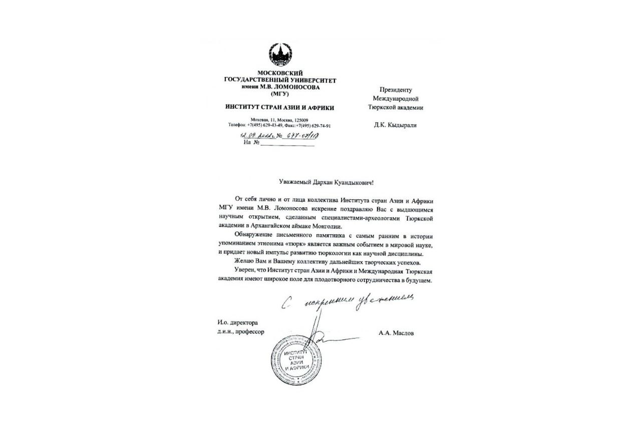 "От себя лично и от имени коллектива Института стран Азии и Африки Московского государственного университета имени М.В. Ломоносова искренне поздравляю Вас с выдающимся научным открытием, сделанным специалистами-археологами Тюркской академии в Архангайском аймаке Монголии. Обнаружение письменного памятника с самым ранним в истории упоминанием этнонима "тюрк" является важным событием в мировой науке, и придает новый импульс развитию тюркологии как научной дисциплины.