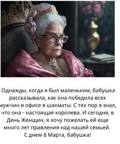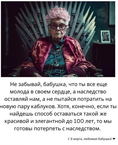 Таким образом получились открытки для жены, мамы, бабушки, подруги и даже любовницы, созданные искусственным интеллектом под руководством человека.