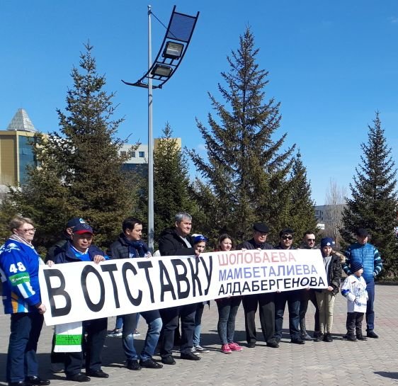 Фото болельщиков "Барыса" с плакатом, на котором написано требование об отставке Шопобаева, Алдабергенова и Мамбеталиева было опубликовано в фанатском твиттере @BarysFans.