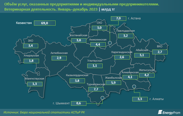 По итогам января-декабря прошлого года в Казахстане оказали услуг в сфере ветеринарной деятельности на сумму 69 млрд тг - на 33,4% больше в стоимостном выражении, чем годом ранее, передаёт BaigeNews со ссылкой на Energyprom.