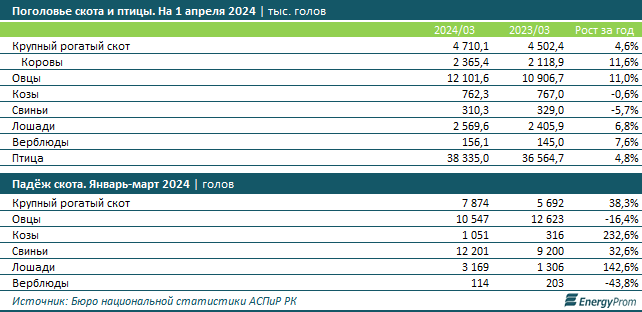 Отдельно отметим: по итогам первого квартала текущего года падёж скота по многих видам животных заметно вырос. Так, падёж коз увеличился в 3,3 раза, до 1,1 тыс. голов, лошадей — в 2,4 раза, до 3,2 тыс. голов, крупного рогатого скота — на 38,3%, до 7,9 тыс. голов, свиней — на 32,6%, до 12,2 тыс. голов. В то же время падёж овец уменьшился на 16,4%, до 10,5 тыс. голов, верблюдов — на 43,8%, до 114 голов.