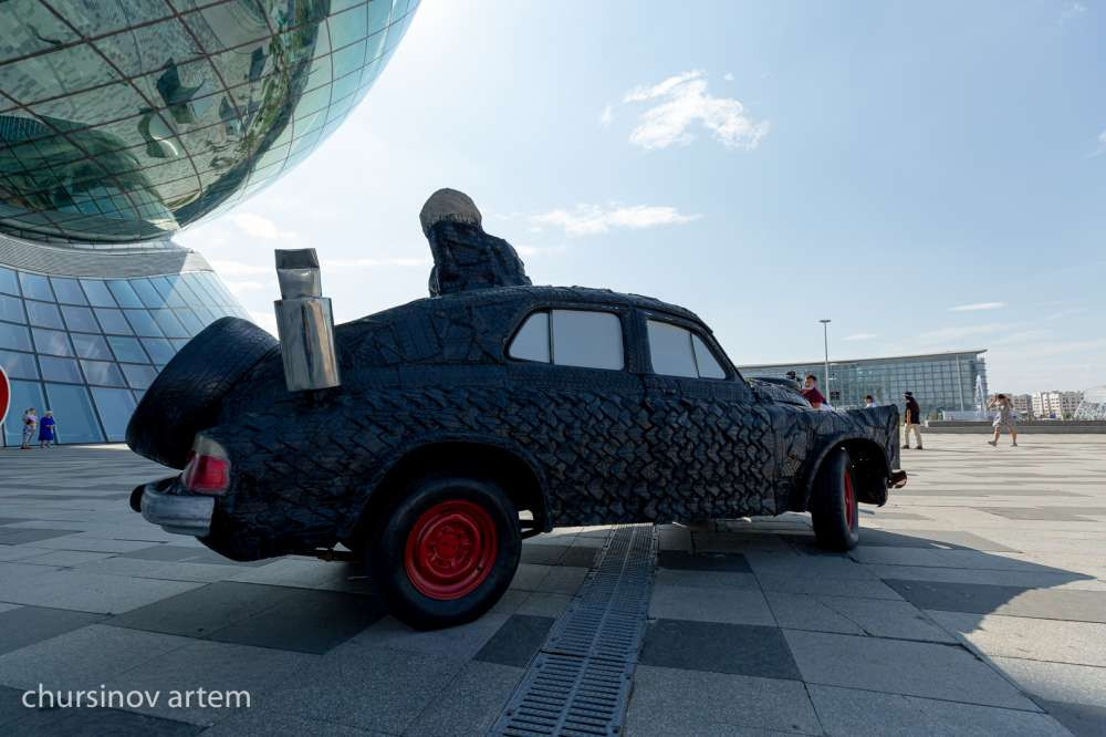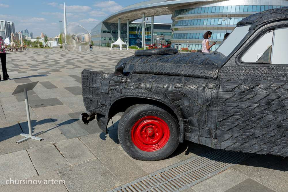 Сверху автомобиля находится балбал — это камни со святых мест из степей Южного Казахстана. Художник специально поехал туда за ними.