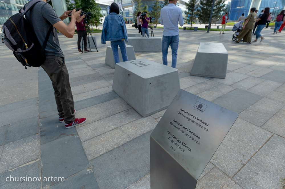 Схожая по тематике, но несколько отличающаяся по исполнению — следующая скульптура, представленная на территории EXPO. Это работа Анастасии Силкиной "Компьютерные клавиши", которая сделана из бетона, но не совсем обычного бетона, а декоративного — он кажется мягче и легче, хотя, конечно, это иллюзия.
