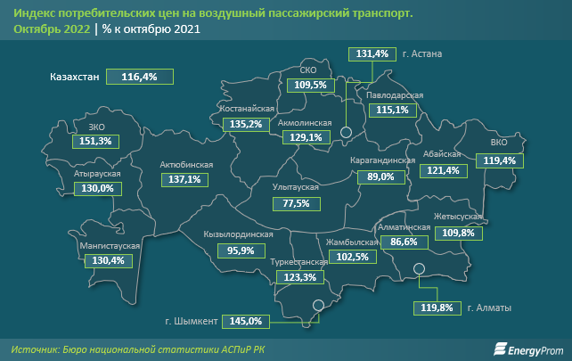 По итогам октября текущего года цены на услуги воздушного пассажирского транспорта в РК выросли на 16,4% за год, передаёт BaigeNews.kz со ссылкой на energyprom.kz.